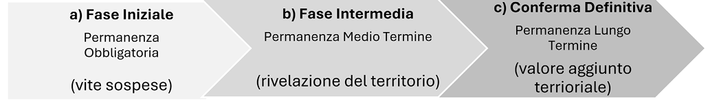 Lo studio evidenzia che la permanenza nel territorio lucano è regolata da eventi e fattori che incidono sui tempi di svolgimento e sulla durata. In primo luogo, si definiscono tre tipologie di permanenza che si avvicendano cronologicamente: 1) una fase iniziale e obbligatoria; 2) una seconda con durata più estesa ma provvisoria; e infine l’ultima tipologia 3) permanente e definitiva.