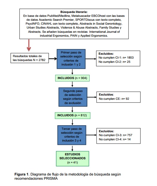Objetivo. Analizar los diseños epidemiológicos más utilizados en el estudio de la relación entre estrés psicológico y problemática musculoesquelética.Metodología. Búsqueda bibliográfica con criterios de inclusión y exclusión específicos, en PubMed/Medline, EBSCOhost y revistas electrónicas de diversas disciplinas siguiendo las recomendaciones del estándar PRISMA. Se extrajeron 2782 artículos de los cuales fueron seleccionados 41 para la revisión.