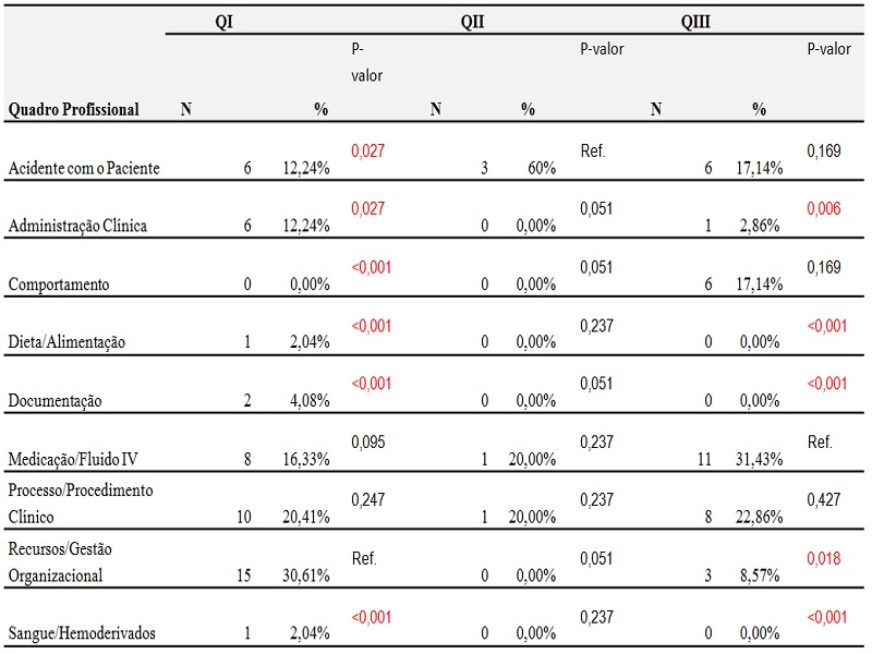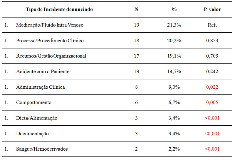Resultados: La investigación mostró que el tipo más frecuente de incidente estaba relacionado con "medicamentos fluídos / IV", con 21,3%. Pero este porcentaje no fue significativamente diferente de los 20,2% del "Proceso / Procedimiento clínico" y de los 19,1% de los "Recursos / Gestión Organizacional". Los datos analizados en los procedimientos éticos y disciplinarios permiten inferir que a pesar de las iniciativas para mejorar la seguridad del paciente, los errores de medicación todavía son un evento común. No obstante, los demás incidentes demuestran la necesidad de poner especial atención a los profesionales. Es latente la necesidad de mejores fuentes de información para la comprensión de los eventos adversos y la profundización de los estudios para el descubrimiento de las verdaderas fuentes de los riesgos relacionados con los cuidados de enfermería.