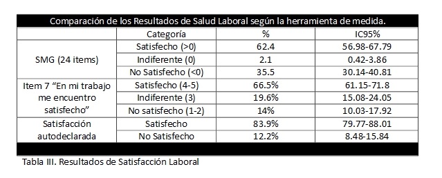 Conclusiones: La mayoría de los profesionales se encuentran satisfechos laboralmente. Presentan una mayor satisfacción autodeclarada que la que se deduce de la medición SMG en Font-Roja. Áreas de mejora: sueldo, promoción profesional y tensión en el trabajo.