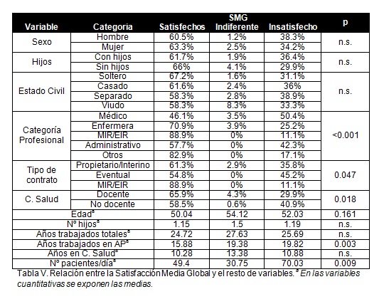 Objetivo: Valorar nivel de satisfacción laboral de los profesionales que trabajan en Atención Primaria en un Área de Asturias y los factores asociados.Metodología: Estudio descriptivo transversal. Población de estudio: profesionales de cualquier categoría que trabajen en Centros de Salud del Área V (Asturias). Muestra: toda la población. Utilizamos el cuestionario validado Font-Roja AP y recogemos variables sociodemográficas y laborales. Las variables cuantitativas se describen con media y desviación estándar, las cualitativas con distribución porcentual de frecuencias. Se buscan posibles relaciones entre satisfacción laboral y resto de variables usando Chi-Cuadrado, t-Student y ANOVA.