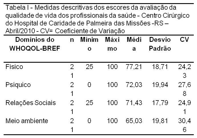 Resultados: Participación de 21 profesionales, 52,4% especialistas, 57,1% son mujeres, el 85,7% casados, con hijos, el 57,1% de 30 a 50 años incompletos de edad, el 42,9% tenían 50 años o más, 66, 6% trabaja 15 o más años en la profesión, el 57,1% optó por el centro de la cirugía, el 71,4% sin exclusividad. En los cuatro dominios del WHOQOL-BREF, el promedio obtenido fue: el físico 77,21, el psíquico 72.03, Relaciones Sociales el 71.43 y Medio Ambiente, el 65,3.