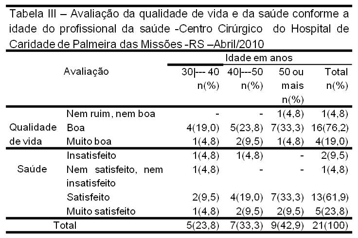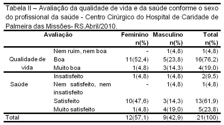 Objetivo: Evaluar la calidad de vida (CDV) del equipo de salud que trabaja en un centro quirúrgico en un hospital general en la región noroeste de Rio Grande do Sul, y relacionarla con las variables demográficas.Método: Es cuantitativo, descriptivo, transversal. Para recolectar los datos se utilizó el WHOQOL - BREF y datos demográficos de 21 profesionales.