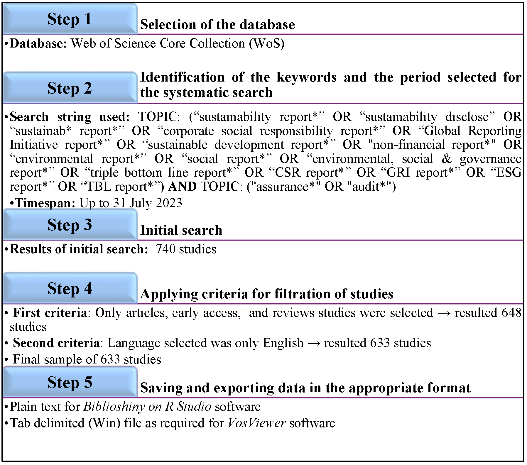 For Step 3, we began our search by using the Topic field to look for specific keywords in the titles, abstracts, and keywords of publications that align with our study's purpose. Our search focused on discussions about environmental reporting, its assurance, and environmental auditing, which have been explored in relevant papers dating back to the 1990s, such as Huizing and Dekker (1992), Duff (1992), and White et al. (1995). We limited our search to studies published between 1990 and July 31, 2023. Our initial search yielded 740 studies from the WoS database until the end of July 2023.