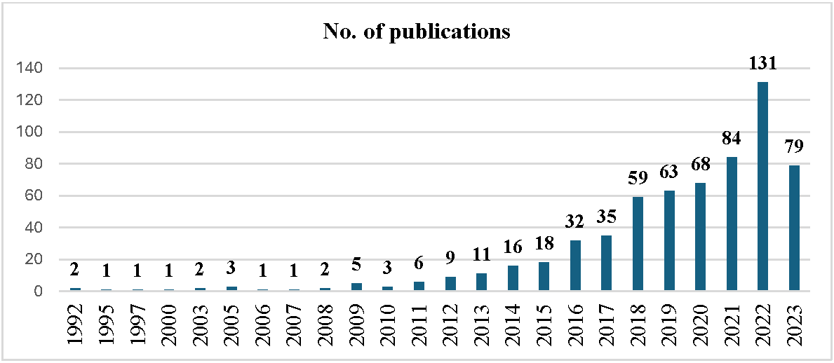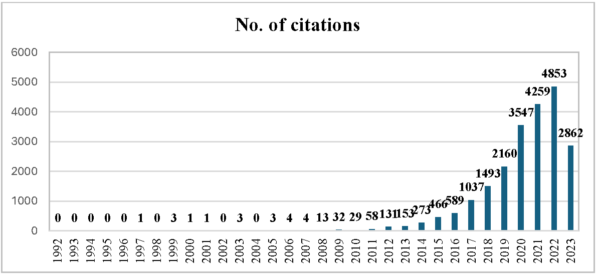 In Figure 3, we can see the number of publications per year in the field of SRA from 1992 to 2023. Figure 4 shows the trend of citations in this field. The research in this area started with a few publications from 1992 to 2010. From 2011 to 2017, there was a more noticeable increase in publications with minor fluctuations. However, there has been a significant surge in scholarly publications in SRA since 2018. Notably, the number of publications has peaked in the last three years (84 in 2021, 131 in 2022, and 79 in 2023 for the first seven months). The number of citations has also shown an upward trend, peaking in 2020-2023, indicating a growing interest in this research field.