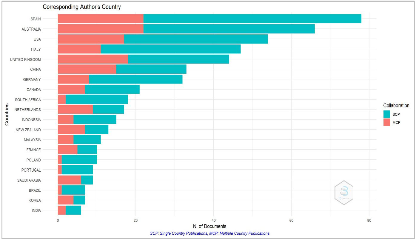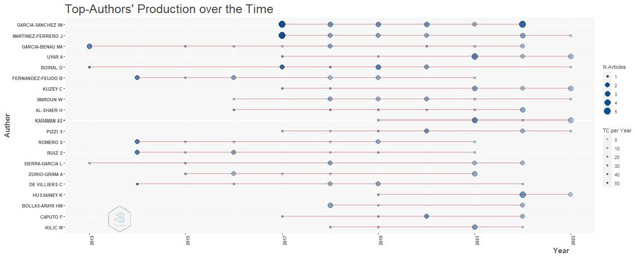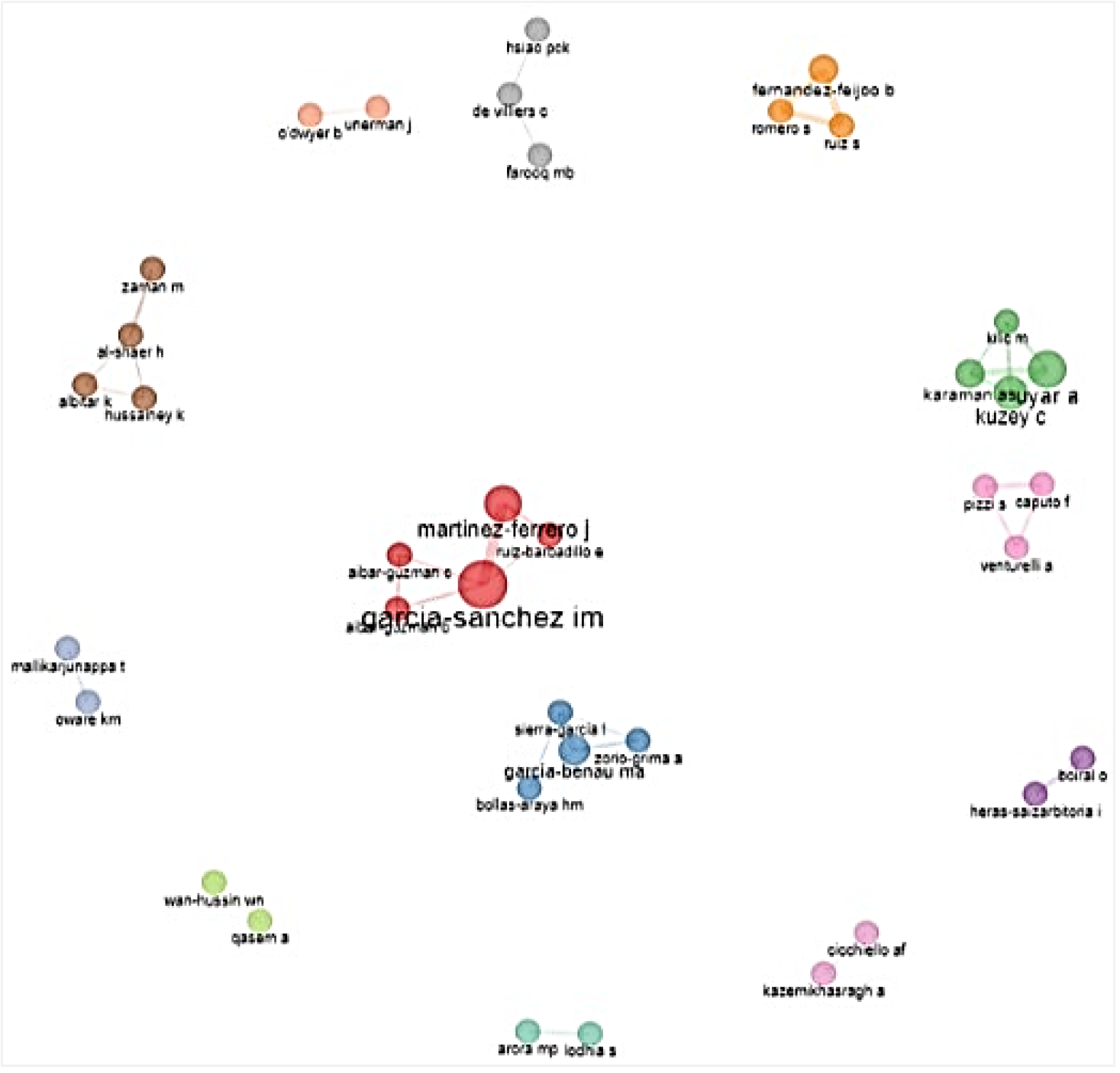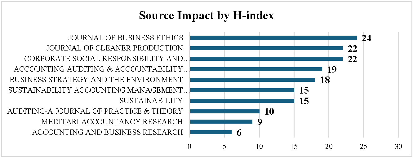 According to Figure 5, we can see the top 10 most influential journals in the field of SRA. The ranking is based on their h-index, which measures the number of studies published by a journal that have at least the same number of citations (Hirsch, 2005). The top 5 journals listed in Table 2 also rank among the top 5 journals based on their h-index, but not necessarily in the same order. For instance, the Journal of Business Ethics has at least 24 publications cited at least 24 times. In contrast, the Journal of Cleaner Production and Corporate Social Responsibility and Environmental Management have at least 22 papers cited at least 22 times. Accounting Auditing & Accountability Journal has at least 19 publications cited at least 19 times, and Business Strategy and the Environment has at least 18 publications cited at least 18 times.