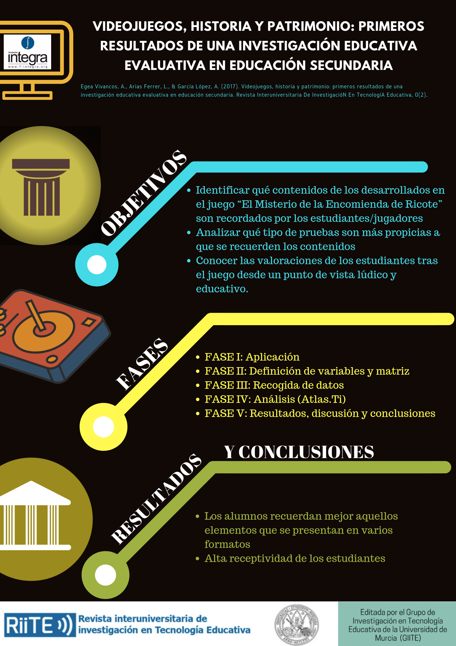 Entre las misiones de la Fundación Integra está el acelerar el proceso de implantación de la Sociedad de la Información en la Región de Murcia, por lo que focaliza una gran parte de su actividad en la generación de múltiples recursos digitales. En el marco de esta línea de actuación se desarrolló en el año 2015 el videojuego de realidad virtual “El Misterio de la Encomienda de Ricote”. Se trata de un contenido interactivo al cual se juega mediante gafas Oculus Rift. Este videojuego está dirigido principalmente a escolares de Educación Secundaria, en concreto a estudiantes de 2.º ESO a 4.º ESO, tanto por el contenido a tratar como por las dinámicas de juego diseñadas. A pesar de que son ya bastante numerosas las propuestas educativas para introducir la historia a través de los videojuegos, en raras ocasiones se procede a una evaluación educativa del videojuego. Aunque en este caso la jugabilidad del producto se demostró bastante alta en diferentes ocasiones, se hacía necesaria una reflexión sobre las ventajas didácticas que este juego podía proporcionar. La evaluación consta de una primera fase de prepilotaje para la que se ha diseñado un primer cuestionario con siete ítems que permiten un análisis de tipo mixto, que ha sido aplicado a modo de prueba piloto en un centro de Educación Secundaria sobre una muestra de 14 individuos de 13-14 años. Gracias a este instrumento, se procura precisar cuáles de las pruebas que se desarrollan durante el juego son más eficaces para el aprendizaje. Así mismo, la evaluación se completa con un segundo instrumento que analiza el nivel de aceptación por parte de los jugadores así como su percepción sobre lo aprendido.