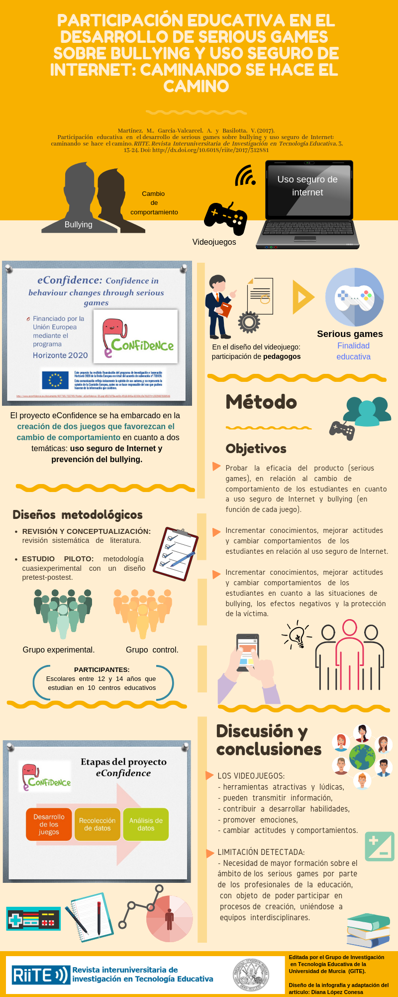Los serious games son videojuegos que pueden ser creados con finalidad educativa, siendo fundamental la presencia de profesionales de la educación en su desarrollo. Se presenta en este artículo la participación que por parte de un grupo de profesionales de la educación se está llevando a cabo en el proyecto “eConfidence: Confidence in behaviour changes through serious games” (ref. 732420), financiado por la Unión Europea mediante el programa Horizon 2020 y en el que participan grupos de investigación y empresas. Con este proyecto se busca comprobar una metodología de desarrollo de serious games para promover el cambio de comportamiento en el usuario, probándolo específicamente con el desarrollo de dos serious games, uno sobre uso seguro de Internet y otro sobre bullying, dirigidos a adolescentes. Para su desarrollo, los educadores participan en varias fases, como la revisión de literatura sobre los contenidos de los juegos, definición de métricas educativas o aplicación de prueba piloto en centros escolares. En el texto se presenta un marco teórico sobre ambos constructos (bullying y uso seguro de Internet) y sobre videojuegos y serious games en educación. Posteriormente, se indican los objetivos, las cuestiones metodológicas, los procesos que se están llevando a cabo, los instrumentos, y los participantes y fuentes de información utilizados. Finalmente, se señalan algunos de los resultados generados hasta el momento y conclusiones a las que se ha llegado en base a la situación actual del proyecto, todo ello desde el punto de vista educativo.